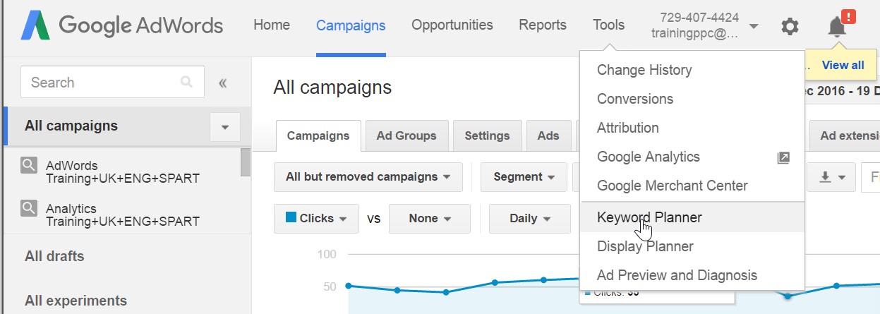 You will need access to your Google Ads account or create a new account using any Google account. Once you’ve logged in, go to Tools at the top of the page and select Keyword Planner from the dropdown menu.