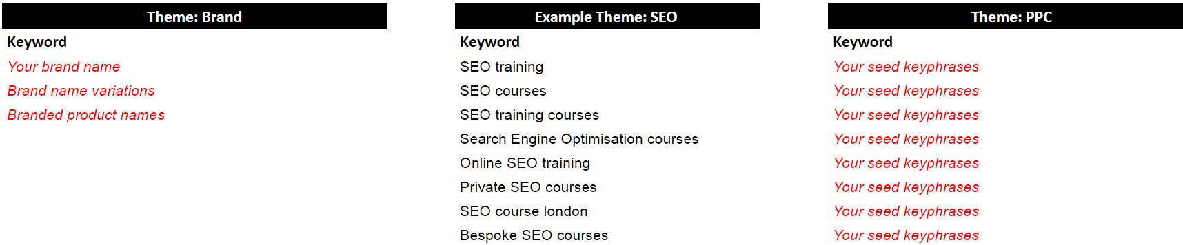 With these queries in mind, create a list in your template of 6-12 seed keywords.