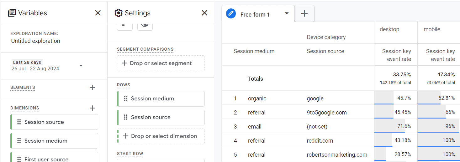 Similarly, when analyzing the session key event rate, you must combine it with session-scoped traffic source dimensions.