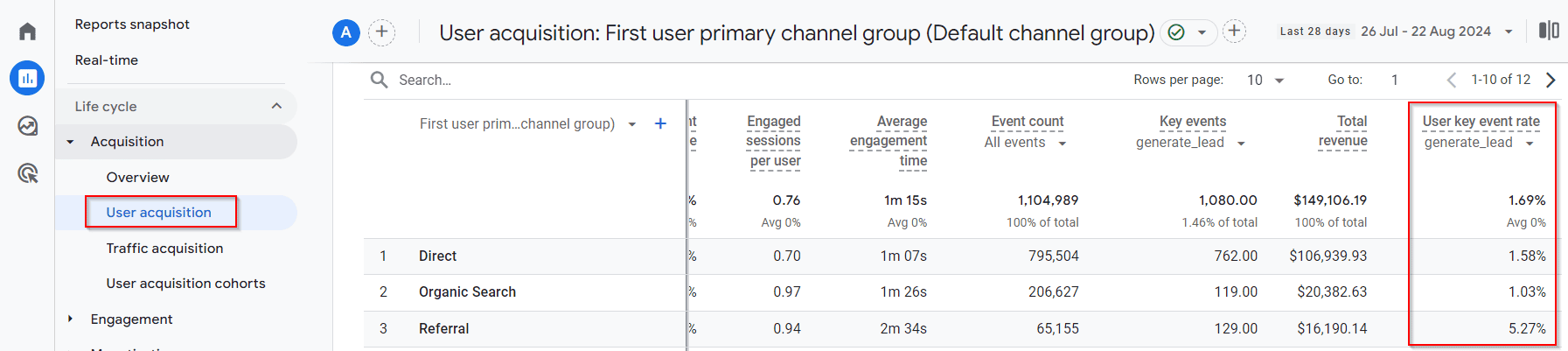 Below is a screenshot showing where you can find the user key event rate metric in the User Acquisition report: