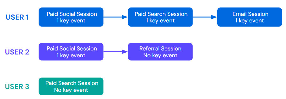 Even though user 1 had multiple sessions where a key event was recorded, they are still counted as one unique user who converted, just like user 2. As a result, the user key event rate for the Paid Social channel in this example would be 66.67% (2 users / 3 users * 100 = 66.67%).