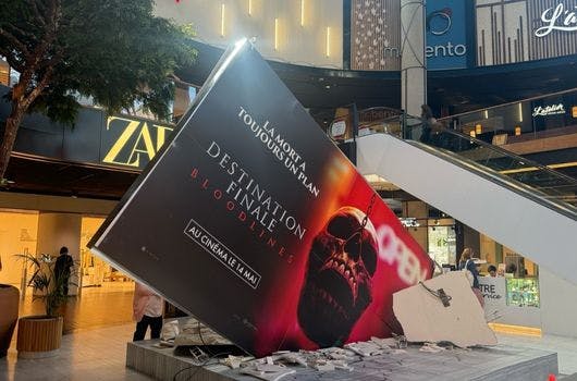 Additionally, Jellyfish achieved a Silver Clio in the Theatrical Out of Home category for the Deadly Billboard, which audaciously grabbed attention for the release of the latest Final Destination: Bloodlines film from Warner Bros. To distinguish the horror reboot in a crowded market, we embraced an absurd concept. The attention-grabbing stunt featured a poster for the film appearing to have dramatically crash-landed through the roof of Les 4 Temps, one of Europe's busiest shopping malls. Located in Paris La Défense, France, this high-traffic location was ideal for surprising and unsettling the thousands of daily visitors (126,000 per day).